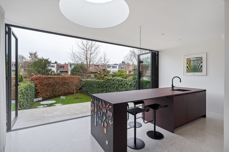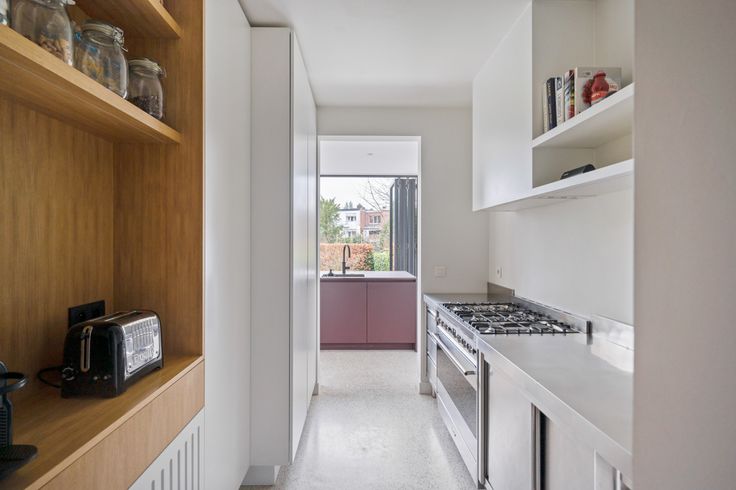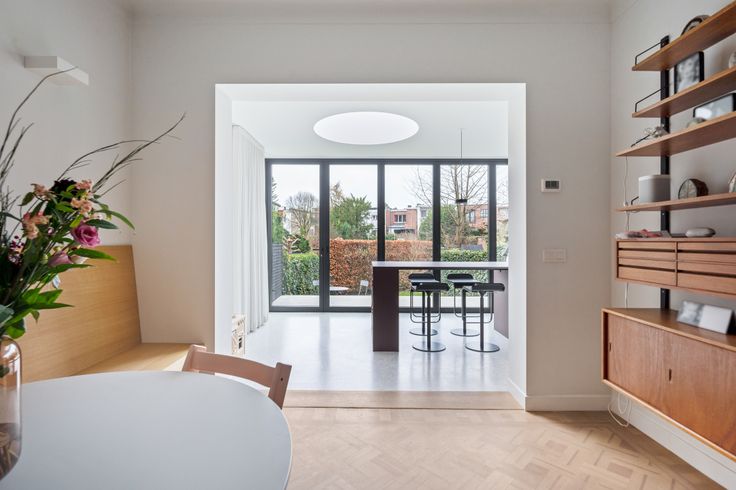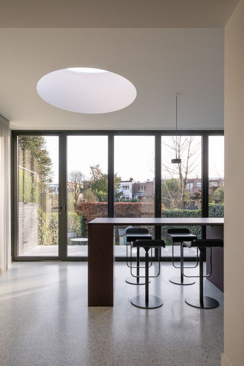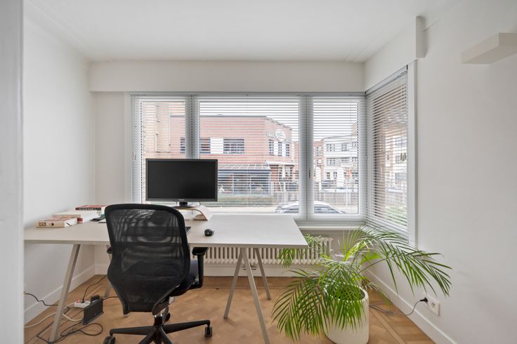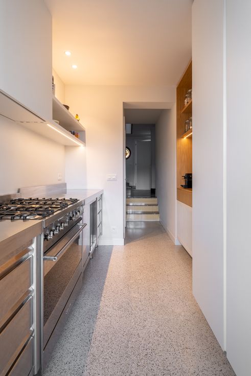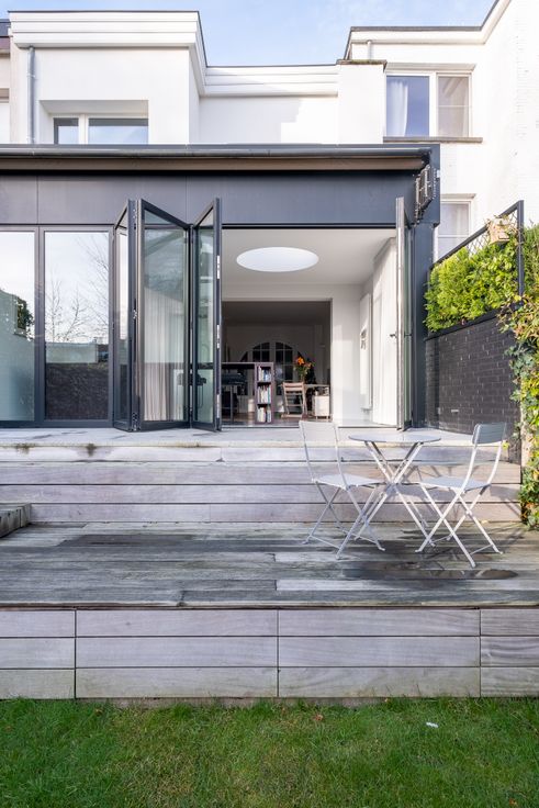 Gelijkvloers: ruime inkomhal met toilet, vestiaire, aparte bureauruimte, een lichtrijke leefruimte en een open keuken gericht op de tuin. De keuken is volledig vernieuwd, uitgerust met de nieuwste toestellen (incl. Quooker, Smeg Fornuis, Liebherr frigo) en voorzien van een vouwraam dat volledig opent naar een terras met zonnetent.