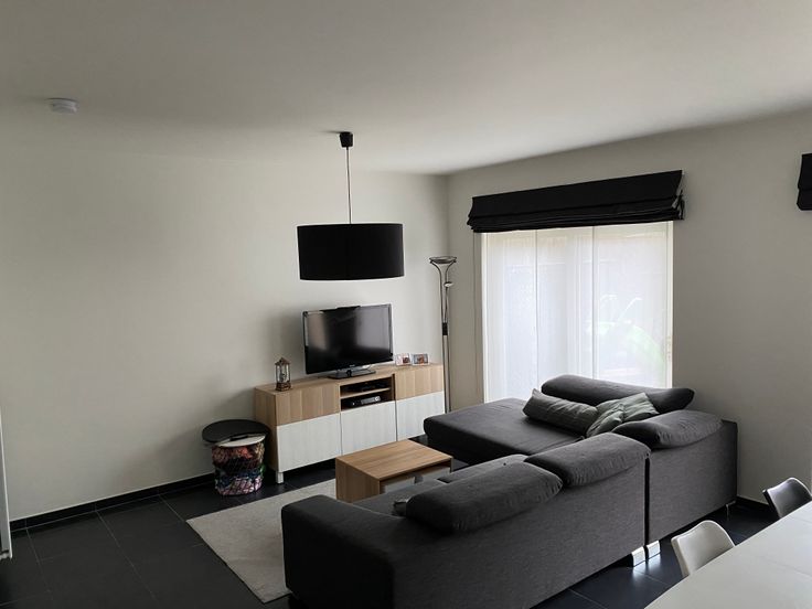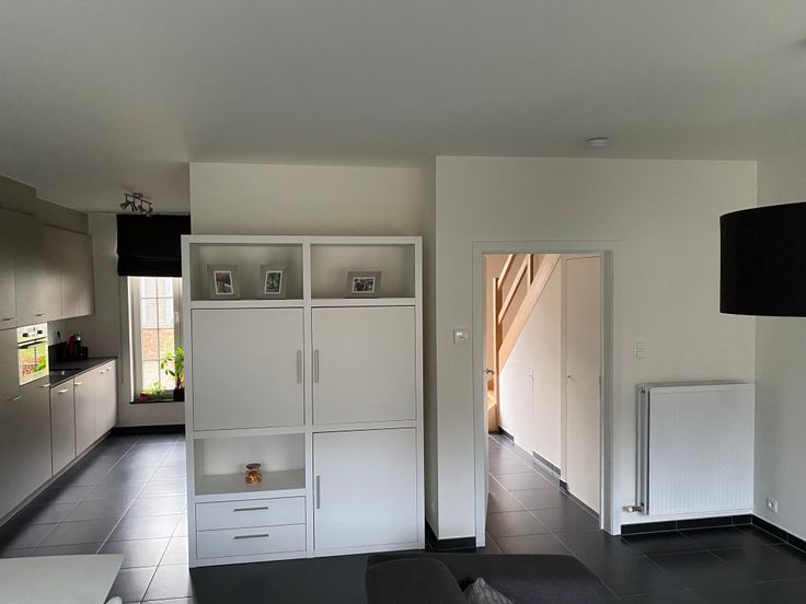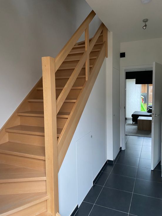 Bij binnenkomst betreed je de inkomhal, incl. gastentoilet. Via de deur bereik je de leefruimte met open keuken. De keuken is uitgerust met alle nodige toestellen en sluit aan op een berging. Vanuit de leefruimte heb je via grote schuiframen toegang tot het terras en de tuin.
