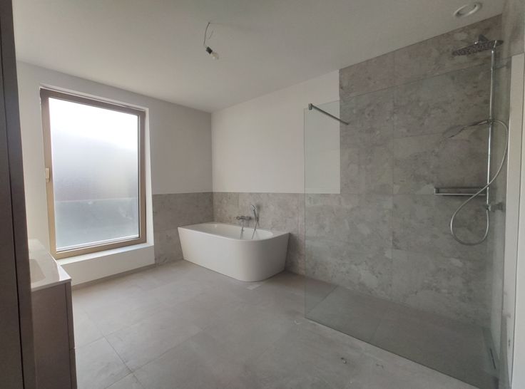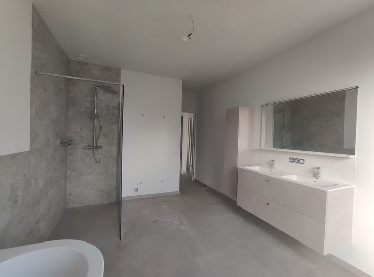 - een badkamer met dubbele wastafel, handdoekdroger, inloopdouche en half vrijstaand bad,