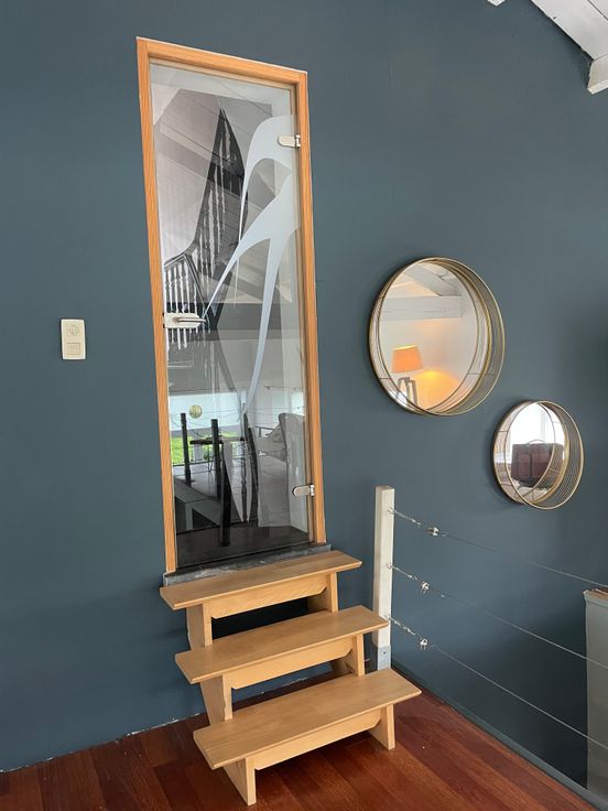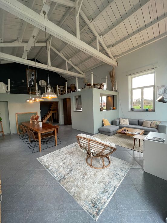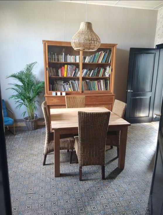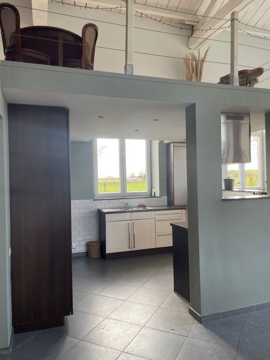 Une entrée indépendante de la maison avec hall d’entrée -grande pièce de vie composée de la salle à manger, un salon, une toilette, une cuisine équipée, une buanderie + mezzanine de 15m2, idéale pour un coin bibliothèque, bureau et un espace de lecture.
