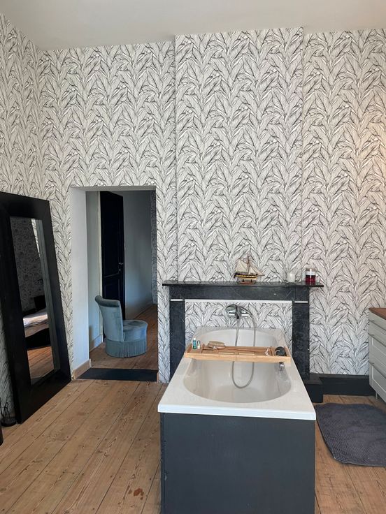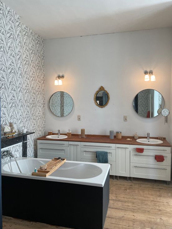 1 salle de bain comprenant une baignoire, une douche, une toilette ainsi que deux grandes vasques.