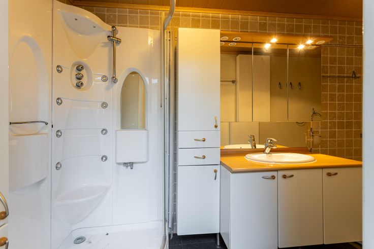 Via de inkomhal (3m²) komen we in de gezellige woonkamer (29m²). Verder is er de lichtrijke open keuken (16m²) met aansluitend de veranda (15m²) die zicht heeft op de tuin. Vanuit de keuken is er toegang naar het toilet, de wasplaats (2m²) en de badkamer (6m²) met wastafel enkel in meubel en hoekbad. De afgebeelde douchecabine is momenteel niet meer in gebruik.