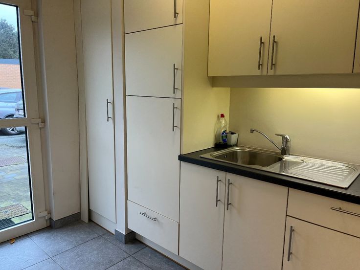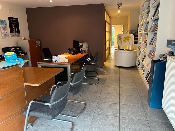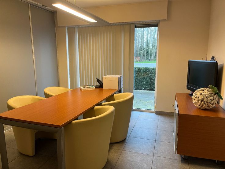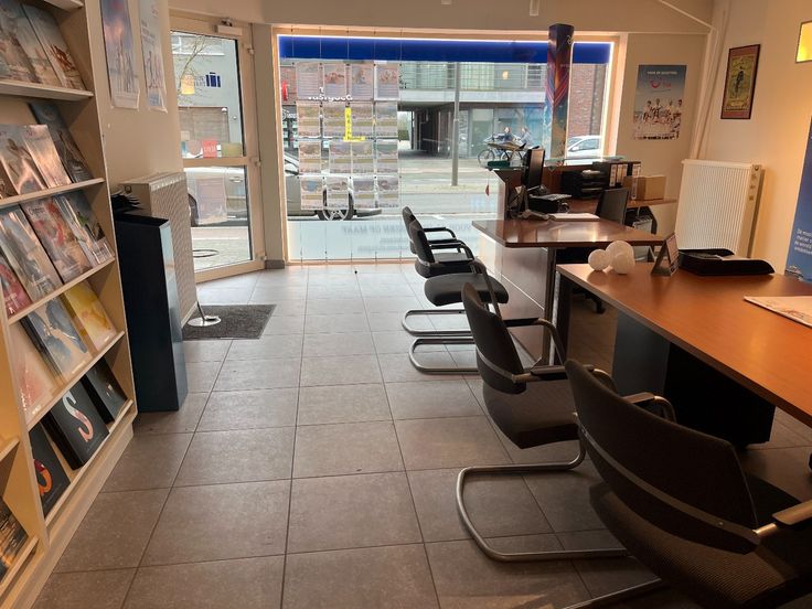 Ontvangstruimte/kantoor, vergaderzaal, apart bureel met ingemaakte kasten, sanitair en kitchenette met achterdeur. Achteraan bevinden zich vrije parkeerplaatsen om uw auto te stallen, in de straat is er voldoende parkeergelegenheid voor uw klanten.