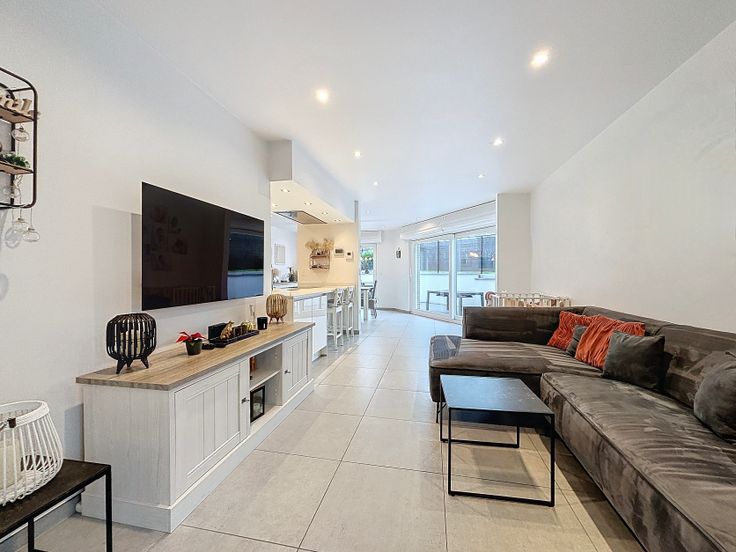 Rez-de-chaussée : 1 hall d'entrée avec 1 WC et dressing sous escalier, 1 cuisine ouverte entièrement équipée , 1 salle à manger lumineuse, 1 salon et 1 garage. Au même étage vous trouverez une terrasse orientée sud. Parking privatif avec 2 emplacements voitures