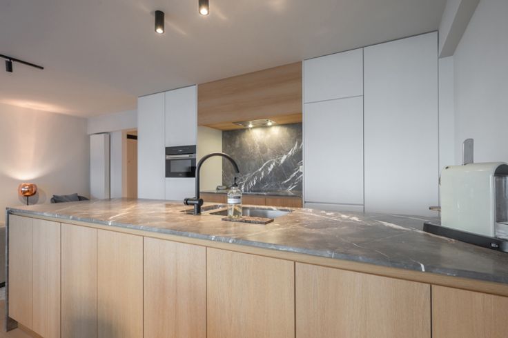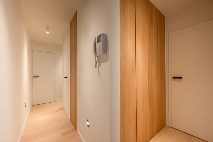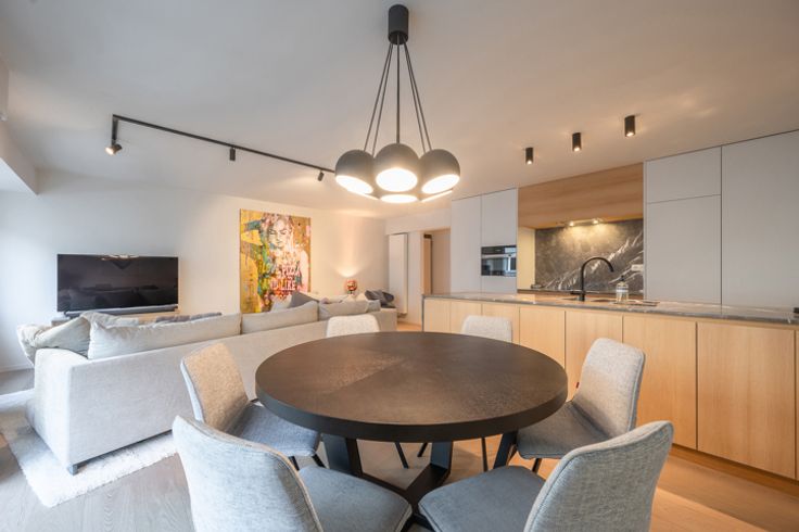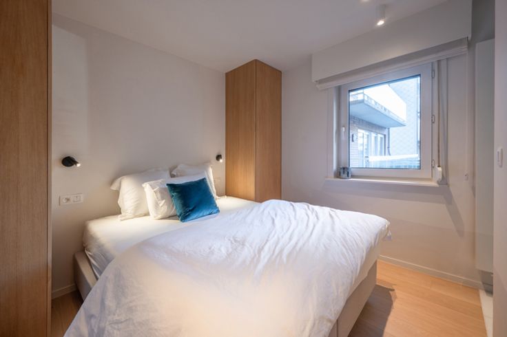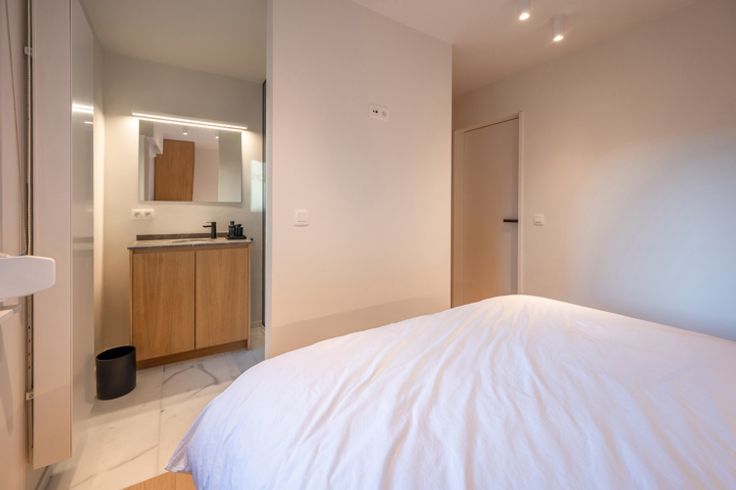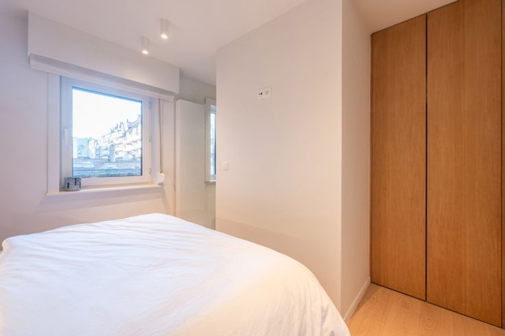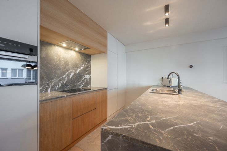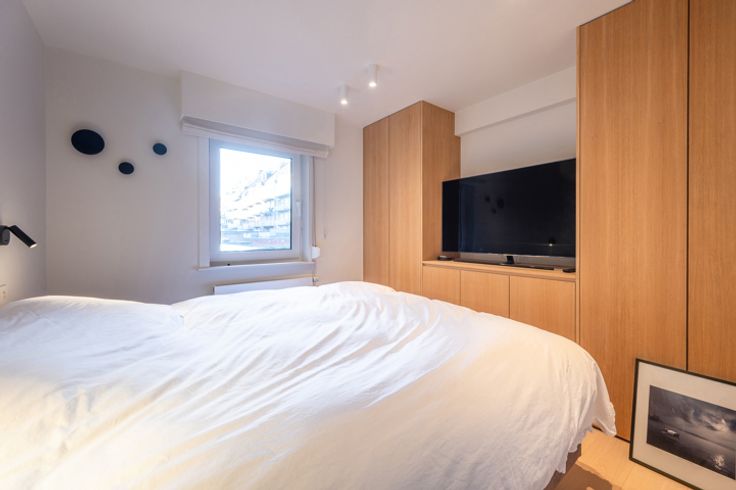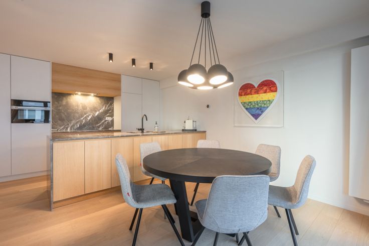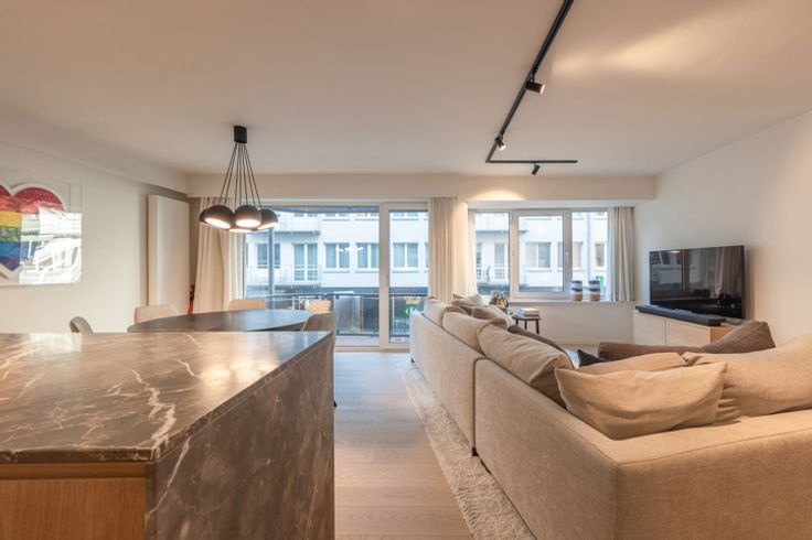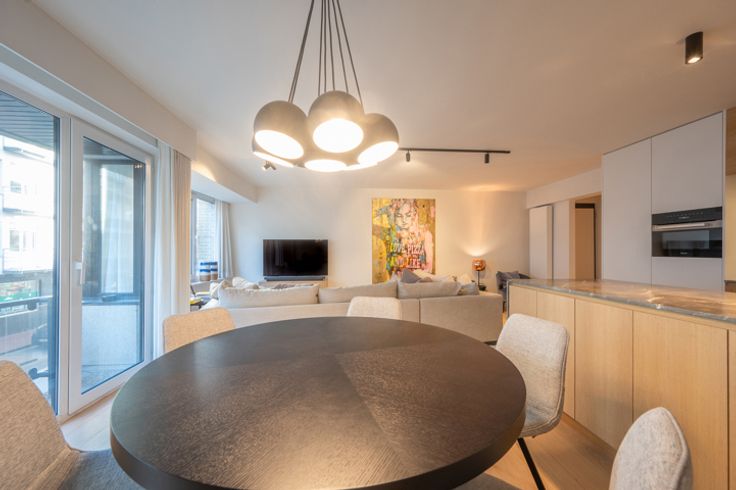 Indeling: inkomhal met een vestiaire, berging (met aansluiting voor wasmachine en droogkast) en een gastentoilet. De ruime leefruimte biedt plaats voor een salon en eetplaats en sluit aan op een klein terrasje waarop u kan zitten met een stoel en tafeltje. Moderne, open keuken met kookeiland, volledig uitgerust met hoogwaardige Miele-toestellen en een marmeren werkblad.