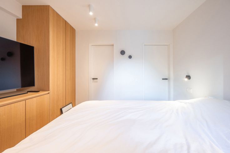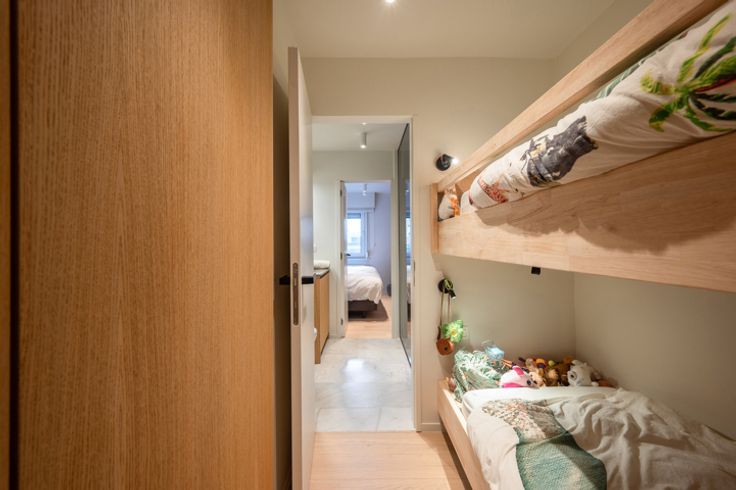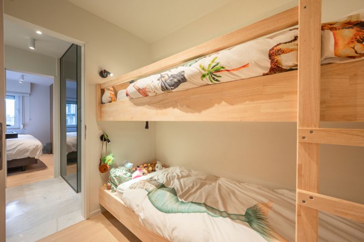 Aan de achterzijde bevinden zich 3 slaapkamers met ingemaakte kasten (fineereik), waaronder één slaapkamer met stapelbed + kleerkast en die ook grenst aan de badkamer.