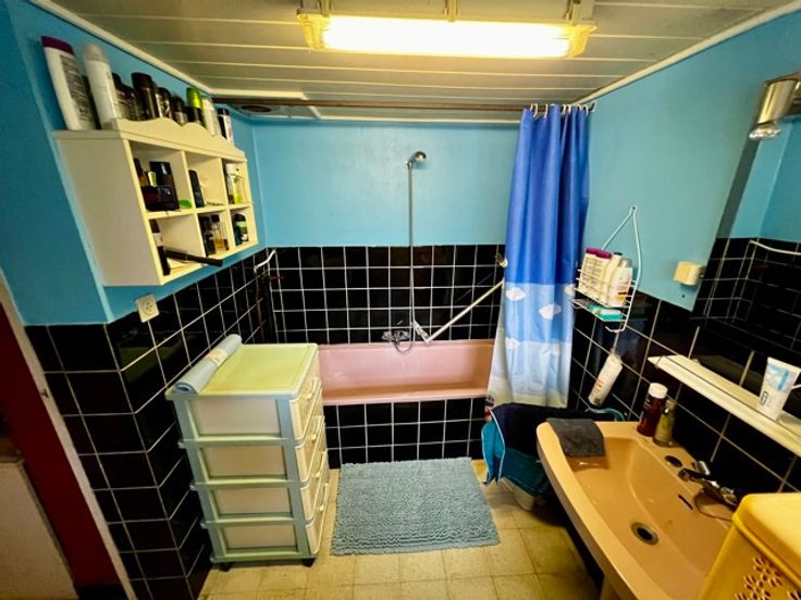 Séjour ouvert – Cuisine semi équipée – Chambre 1 – Chambre 2 – Wc - Salle de bain (baignoire, meuble vasque)