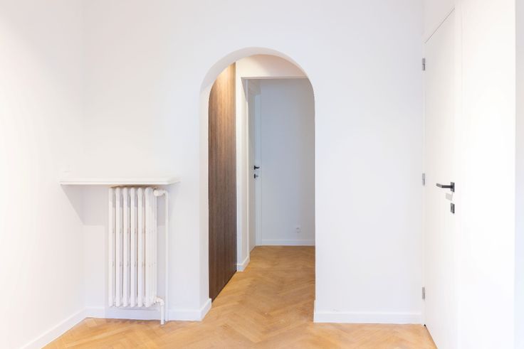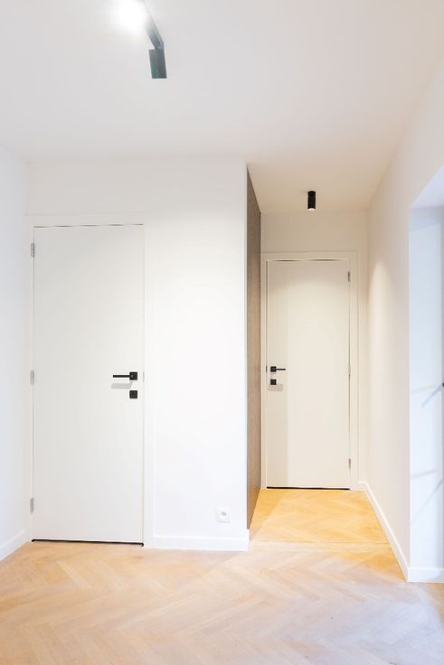 Bij binnenkomst in de inkomhal word je meteen verwelkomd door ingebouwde kasten en een charmante doorgang, die een warme en uitnodigende sfeer creëert. Vanuit de hal leidt een stijlvolle stalen deur naar de woonkamer. Deze woonkamer is afgewerkt met een elegante visgraat parketvloer en voorzien van een op maat gemaakte kastenwand, wat zorgt voor een harmonieus en praktisch interieur.