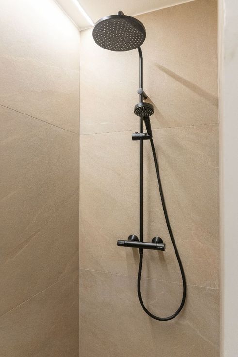 De badkamer straalt luxe uit met een dubbele wastafel, een handdoekradiator en een ruime betegelde inloopdouche, waar comfort en stijl samenkomen.