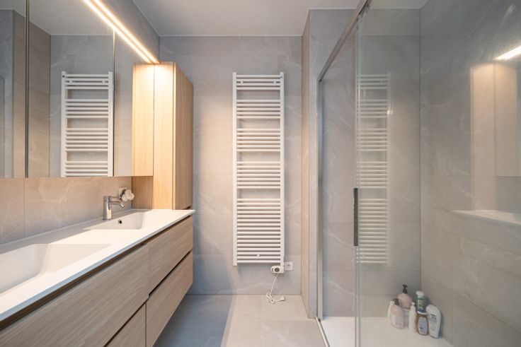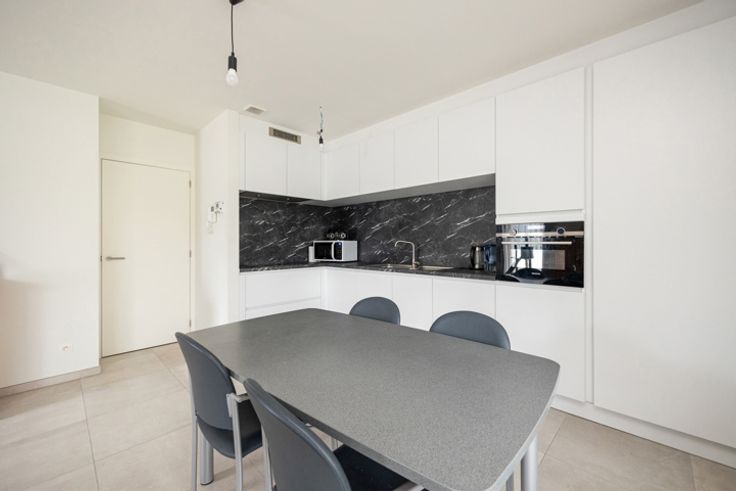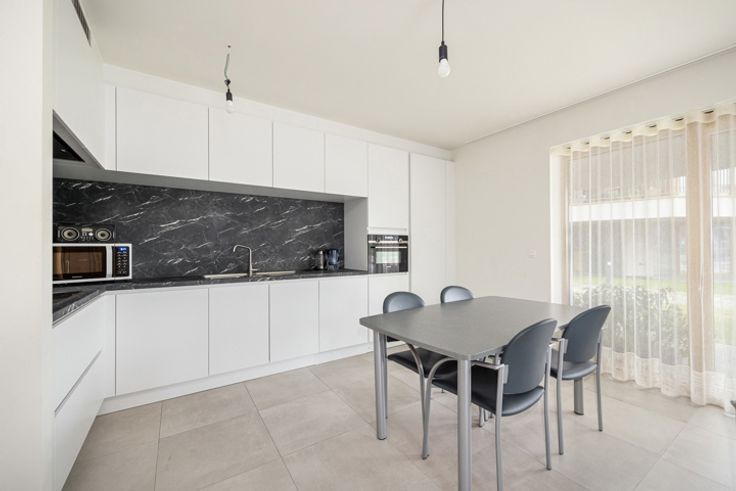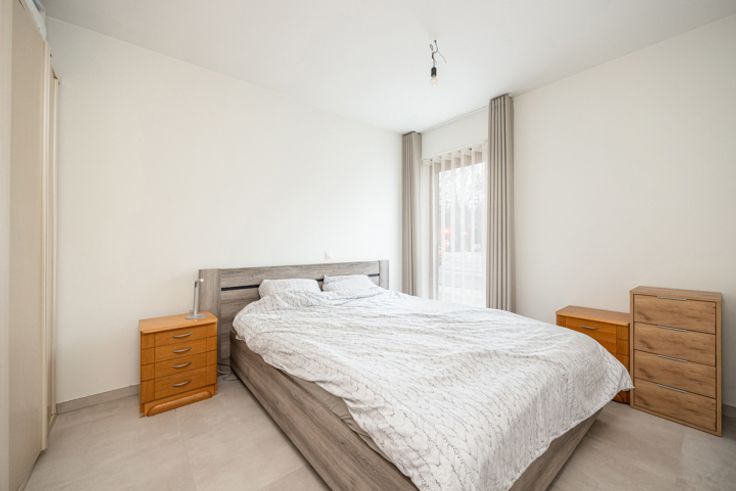 INDELING Inkomhal met op maat gemaakte kast. Deze hal geeft toegang tot de 2 slaapkamers 12 m² en 8m², het apart toilet, de badkamer met inloopdouche en lavabo en de de berging/wasplaats. Lichtrijke leefruimte ca 30m² met open keuken dewelke toegang geeft tot het overdekt terras. BIJZONDERHEDEN Luxueus afgewerkt appartement voorzien van vloerverwarming en ventilatie dat voldoet aan de hedendaagse normen qua energieverbruik. 2 ondergrondse staanplaatsen en kelderberging verplicht bij aan te kopen voor €30.000 POSITIEVE ASPECTEN Nieuwstaat Hoogwaardige afwerking Energiezuinig Gelijkvloerse verdieping