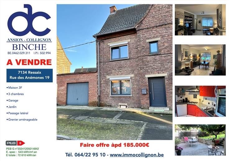 Sorry er is geen nederlandse vertaling beschikbaar. Ressaix, à vendre, cette excellente maison 3 façades avec jardin et garage. Se composant comme suit : hall d'entrée, très beau living (salon, salle à manger) offrant une belle luminosité et une vue sur la terrasse et le jardin. Cuisine entièrement équipée, espace de rangement, salle de bain (douche, bain, évier, wc). Au 1er étage : hall de nuit et 3 chambres (ou deux chambres et un bureau ou dressing). Au 2ème étage : grenier et espaces de rangement, possibilité de deux à trois chambres supplémentaires moyennant aménagement. Très belle superficie habitable de +/- 135 m2. Grand garage attenant à la maison et permettant un accès par l'arrière, parking aisé devant l'habitation. Double vitrage et volets. Chauffage central au gaz. Passage latéral. Agréable terrasse et très beau jardin idéalement orienté. Ce bien, qui vous offrira tout le confort recherché, est situé dans une rue calme tout en se trouvant à quelques mètres de commerces de proximité, des facilités courantes de transport ainsi que des axes vers Binche, Mons, Charleroi. Très belle opportunité à saisir. Faire offre à partir de 185.000 EUR. Visites et renseignements au 064/229510. PEB- G, N°20241205014842, 543 kWh, 72610 KWh/an