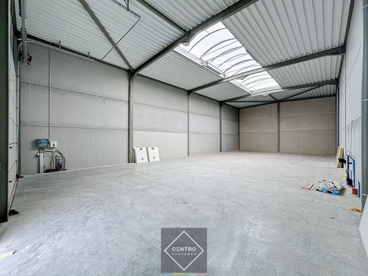 - Geïsoleerd plat dak bestaande uit geprofileerde staalplaten met centrale lichtstraat (3m x 12m, voorzien van meerwandige polycarbonaat platen), voorzien van rook -en warmteafvoer systeem).