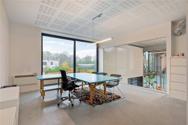 De huidige indeling voorziet op het gelijkvloers een aangename open space/ showroom met een aangename vrije hoogte, een volledig uitgeruste keuken, gescheiden sanitair alsook een douche en een magazijn (ca. 62 m²) met toegang via een poort. De eerste verdieping is ingedeeld als open space met een afgesloten kantoor of meeting room.