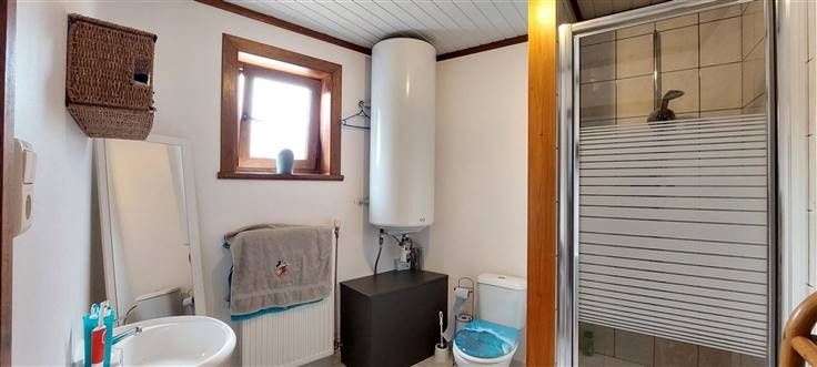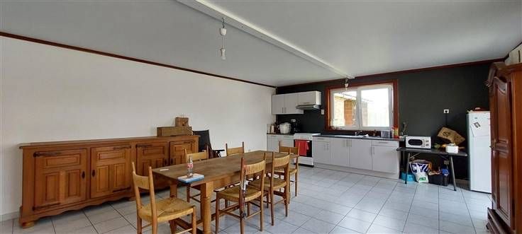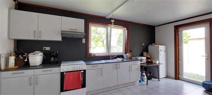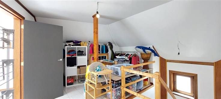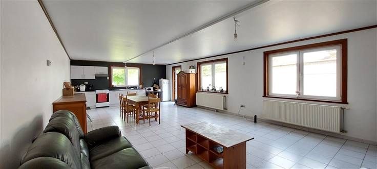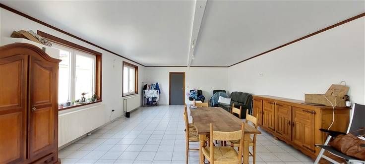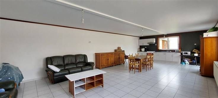 Rez : hall (+/- 8.5m²), séjour ouvert sur cuisine (+/- 56 m²)- évier simple, cuisinière électrique, hotte et four - salle de douche (+/- 6.5 m²)- douche, wc et lavabo -