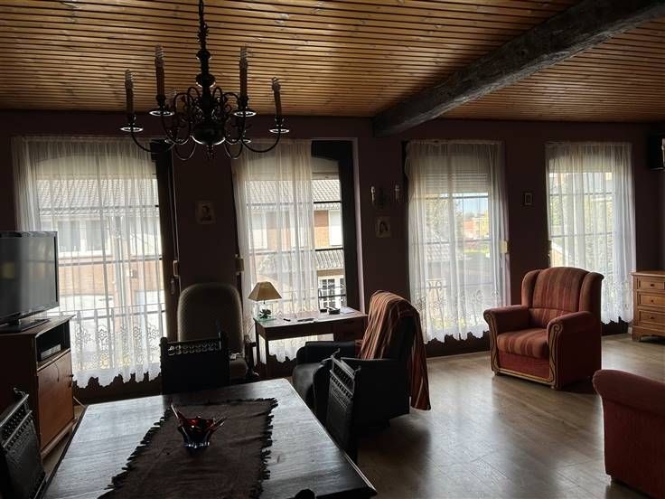 - à l'étage, d’un spacieux living (35 m²), d’une cuisine semi- équipée, d’une chambre (14m²), d’un hall, d'une salle de bain avec baignoire et d’un WC séparé.