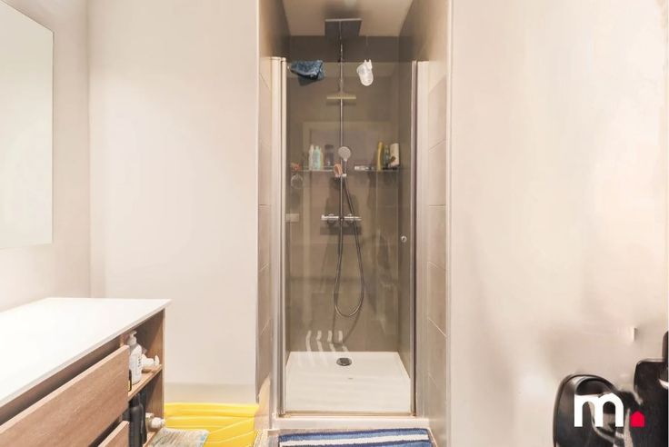 De badkamer op het gelijkvloers is modern en praktisch ingericht, met een douche, wastafelmeubel en spiegel, en een handdoek droger. Er is ook een afzonderlijk toilet aanwezig.