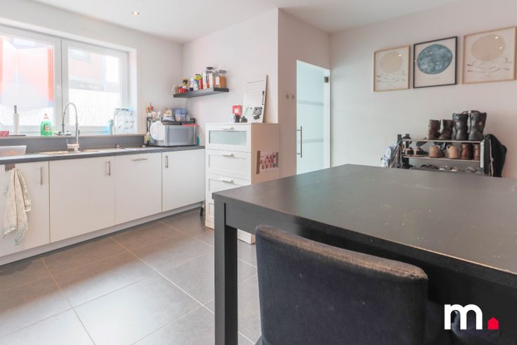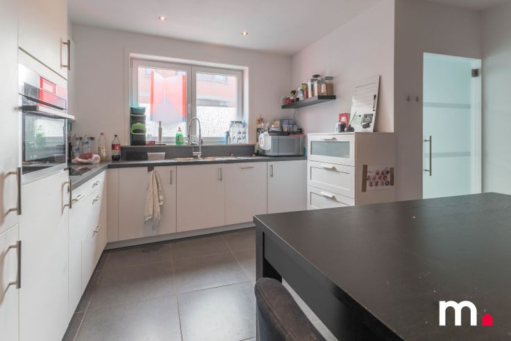 Bij binnenkomst komt u in een ruime inkomhal, die leidt naar een lichtrijke keuken is uitgerust met alle moderne voorzieningen, waaronder een inbouwkoelkast, vrieser, vaatwasser, inductie kookplaat en dampkap. De ruime keuken creëert een extra plek om te eten of te ontspannen, en de talrijke kasten zorgen voor voldoende opbergruimte.