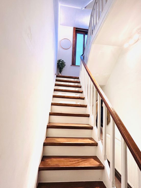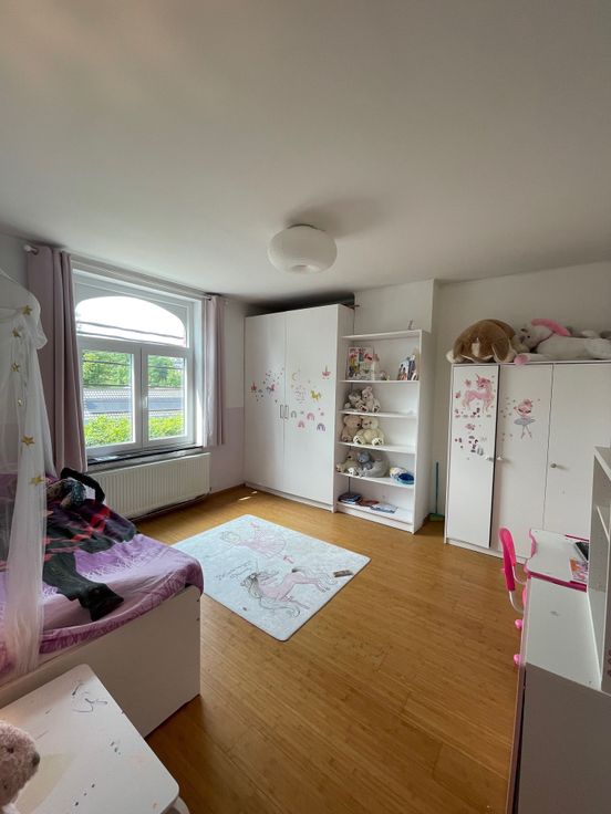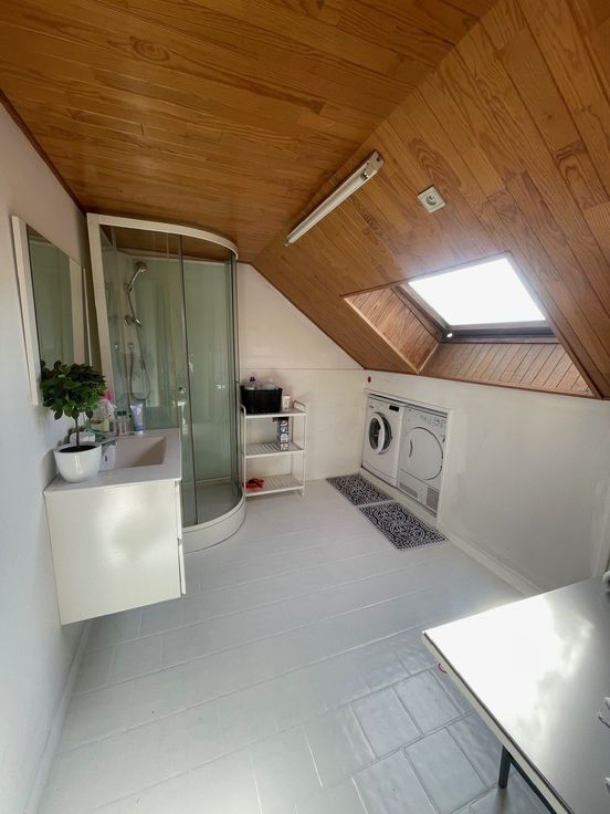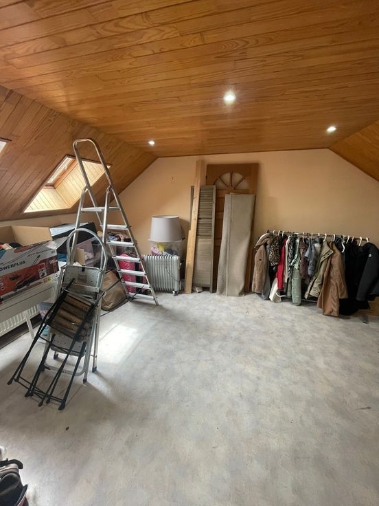 -Au grenier : un grande pièce spacieuse aménageable en dressing ou grand bureau + une plus petite pièce (sans fenêtre) qui peut servir de bureau ou de pièce de rangement + une salle de bain (douche) que nous utilisons comme salle des machines (machine à laver et sèche linges).