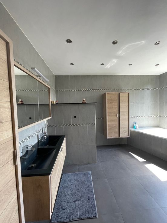 - A l'étage : 3 chambres dont 2 avec placards + 1 grande salle de bain (toilette, douche à l'italienne et baignoire)