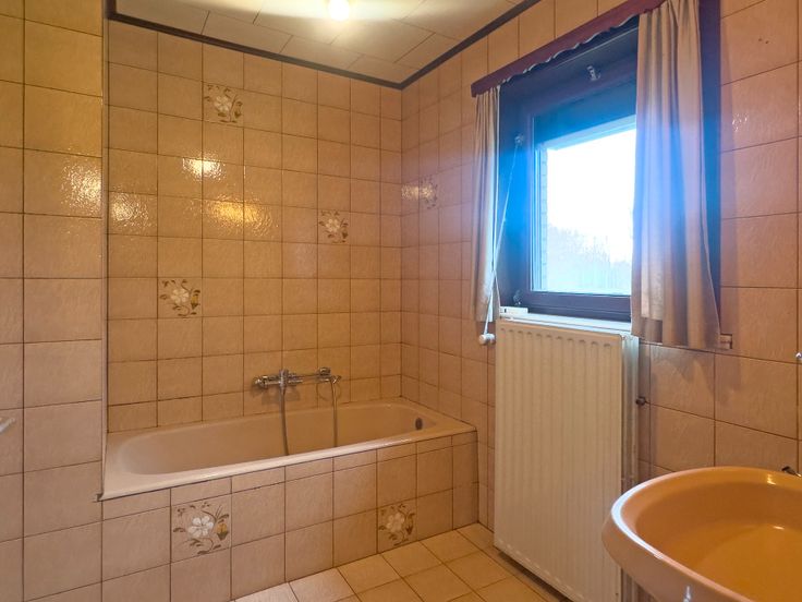 Eerste verdieping: inkomhal, gastentoilet, leefruimte (46m²) met veel licht en uitzicht op bosgrond, keuken, opbergruimte, badkamer voorzien van ligbad en lavabo. Ruime veranda met weids uitzicht.