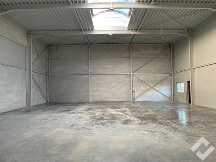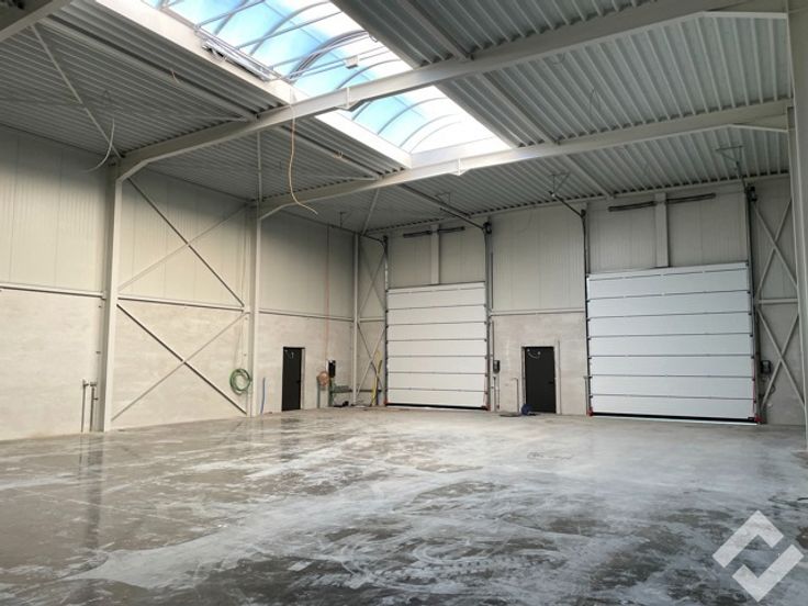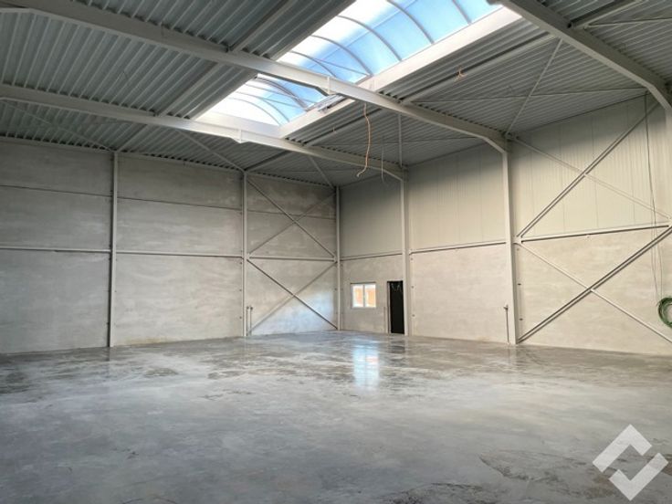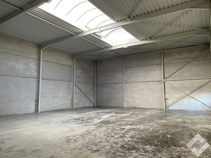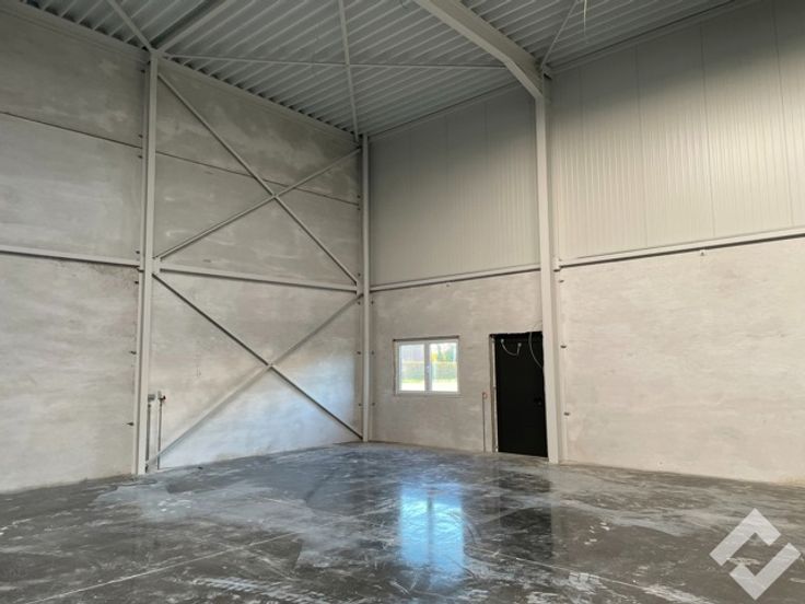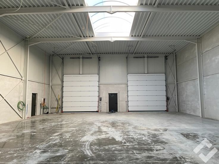 Deze hal is opgetrokken in staalconstructie en geïsoleerde panelen en heeft een oppervlakte van 336m2. Voorzieningen zoals twee automatische sectionaalpoorten, industriële betonvloer, lichtstraat met RWA-afvoer, stroomvoorzieningen en verlichting. zijn aanwezig. Er is een vrije hoogte van ca. 7,5m wat heel wat mogelijkheden biedt inzake opslag. Bijkomend is er mogelijkheid om een kantoor te voorzien door de extra deur met raampartij. Buiten zijn er voldoende parkeerplaatsen aanwezig.