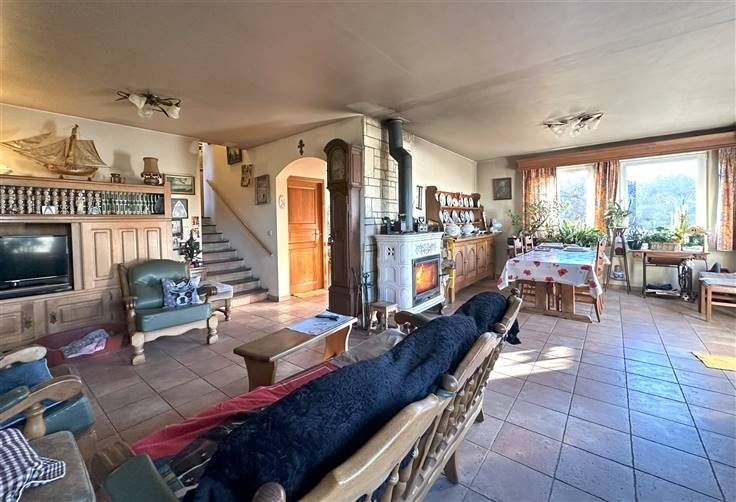Sorry er is geen nederlandse vertaling beschikbaar. Dans un quartier calme et agréable, nous vous proposons à la vente cette villa atypique composée de deux volumes. L'un se compose d'un garage et d'un beau bureau qui pourra accueillir, par exemple, une profession libérale et à l'étage, une mezzanine et un grenier à aménager. Sur l'arrière, relié par le hall d'entrée, le second bâtiment. Il s'agit d'une jolie villa possédant au rez un bel espace de vie, une grande cuisine équipée et une petite verrière; à l'étage, vous y découvrirez trois chambres, une salle de bain et un accès à un grand grenier offrant un beau potentiel. Le tout agrémenté de plusieurs caves, d'une terrasse carrelée orientée Sud-Ouest, d'un beau jardin avec une vue sur les campagnes, un chalet de jardin avec coin barbecue et un grand parking. Au niveau des techniques : l'électricité est conforme, les châssis double vitrage bois, chauffage central au mazout, citerne d'eau de pluie, poêle à bois magnifique -> PEB D. Belle opportunité à saisir.