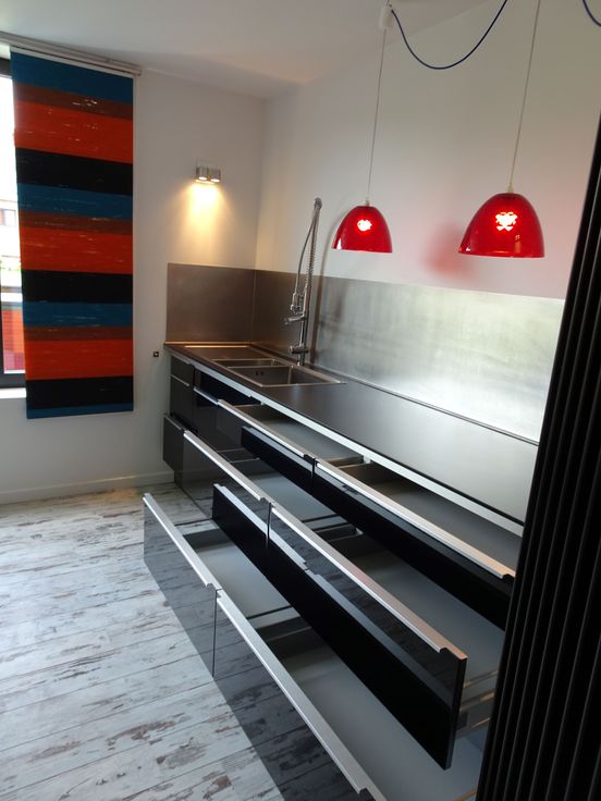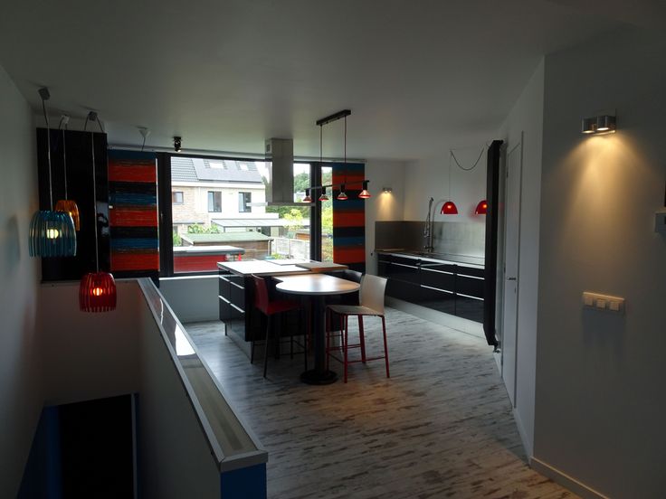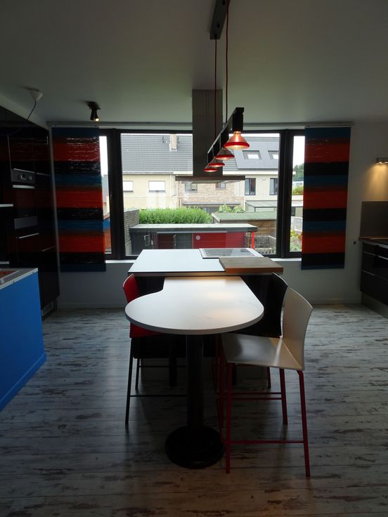 Appartement 2: - bewoonbare oppervlakte 94m² Het appartement op de eerste verdieping heeft een ruime leefruimte met zithoek en eetkamer en aansluitend een open keuken met keukeneiland. De berging is eveneens via de moderne keuken te bereiken. Het appartement biedt veel lichtinval dankzij de grote schuiframen die toegang verlenen tot het terras. Naast de trap naar de tweede verdieping bevindt zich een apart toilet. Op de tweede verdieping is er een slaapkamer in loftstijl voorzien van douch.