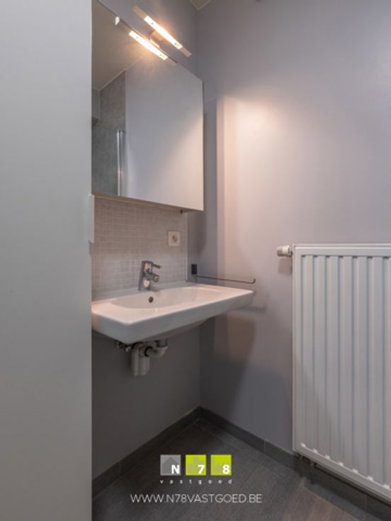 - Badkamer (1,91m x 2,27m = 4,34m²): douche, hangtoilet, lavabo met spiegelkast, tegelvloer.