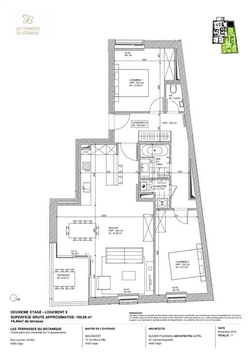 Sorry er is geen nederlandse vertaling beschikbaar. Situé au 2ème étage de la résidence Les Terrasses du Botanique, cet appartement de 101 m² comprend hall, living ouvert sur la cuisine, 2 chambres, wc, salle de bains, buanderie, terrasse de 6 m² orientée au sud et une cave - emplacement de parking au sous-sol en option. La qualité des finitions et des matériaux utilisés ainsi que l'architecture à la fois moderne, élégante et bien intégrée dans un quartier historique confèrent standing et personnalité aux différents appartements de la résidence. La proximité du jardin botanique, de la gare de Liège-Carré et des nombreux commerces de la rue Saint-Gilles et du centre ville en font un endroit de premier choix.