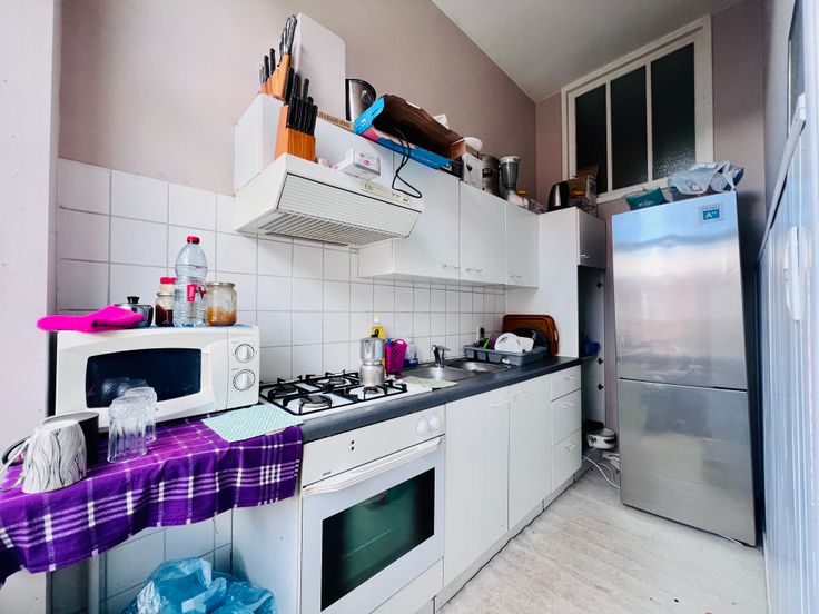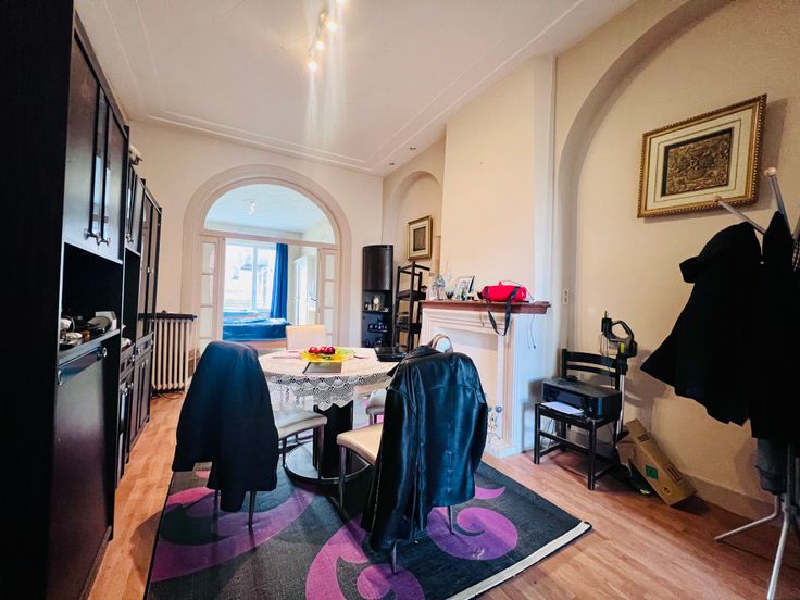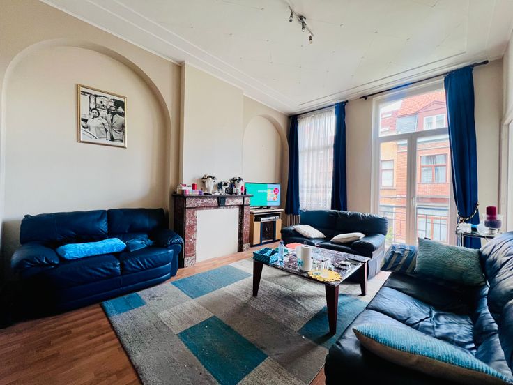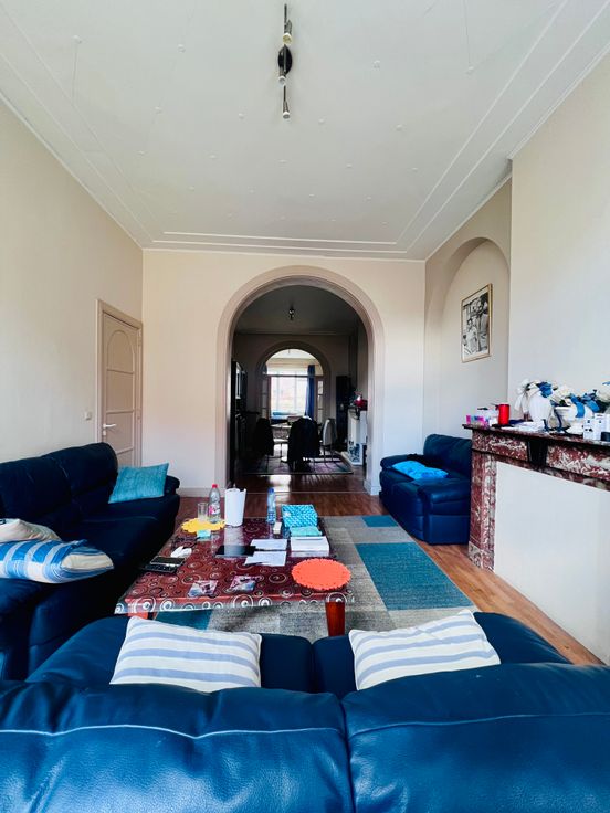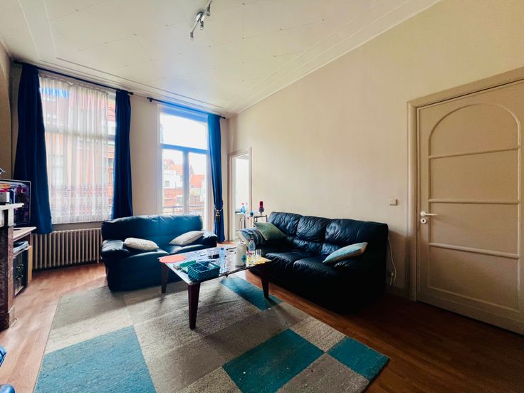 KOEKELBERG / Quartier Royal. Agréable APPARTEMENT au 1er étage sans ascenseur. Il se compose d'un hall, 3 pièces en enfilade (salle à manger +- 21,60m², salon +- 18,78 m², chambre +- 16,30m²), BALCON +-3 m², cuisine semi équipée +- 5,25m², Salle de bain (évier, wc, bain). Cave. Charge Commune : +- 30 euros/mois. Chaudière individuel au gaz, double vitrage (récent), porte blindée, parlophone, haut plafond. PAS D'ASCENSEUR! PEB 216KWH/m²(E+), 43KG CO², PEB n° 0000689499-01-6
