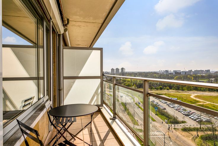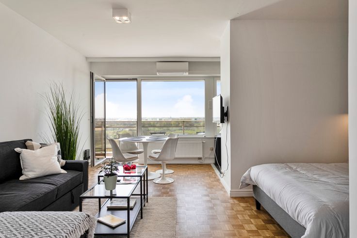 Deze recent gerenoveerde gemeubelde studio (2021) is gelegen op de 11de verdieping. De huurprijs ligt op €1.400 per maand incl. kosten. De studio heeft een oppervlakte van 40 vierkante meter en een zuidgericht terras van 5m2 met volautomatische rolluiken, waar het heerlijk vertoeven is bij zonnig weer. Er is een prachtig uitzicht op het groene park van de "konijnenwij", het nieuwe justitiepaleis en de schelde.