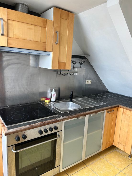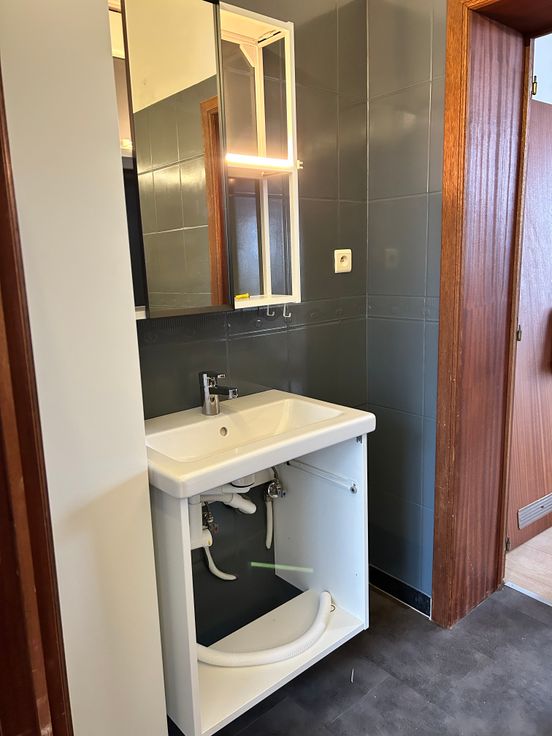 Superficie de 40 m2 comprenant un séjour, une cuisine équipée (taque, four et petit frigo), une chambre donnant sur un parking à l’arrière du bâtiment, une salle de bain récemment rafraîchie.