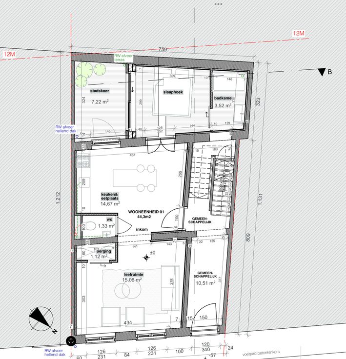 Het gelijkvloers appartement bestaat uit een sfeervolle woonkamer, eetkamer met open keuken, een gezellige slaapkamer, badkamer met regendouche, een apart toilet en toegang tot een beschut terrasje. Extra’s omvatten een private berging van 4 m² in de kelder en een gedeelde wasruimte met Siemens wasmachine en droogkast.