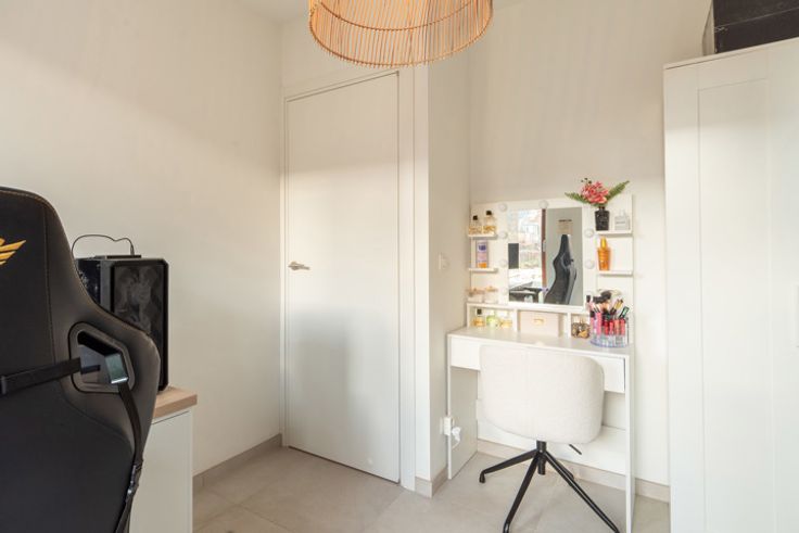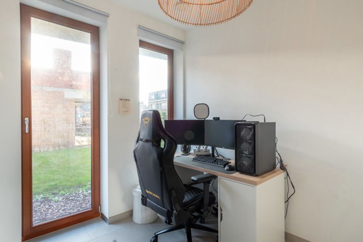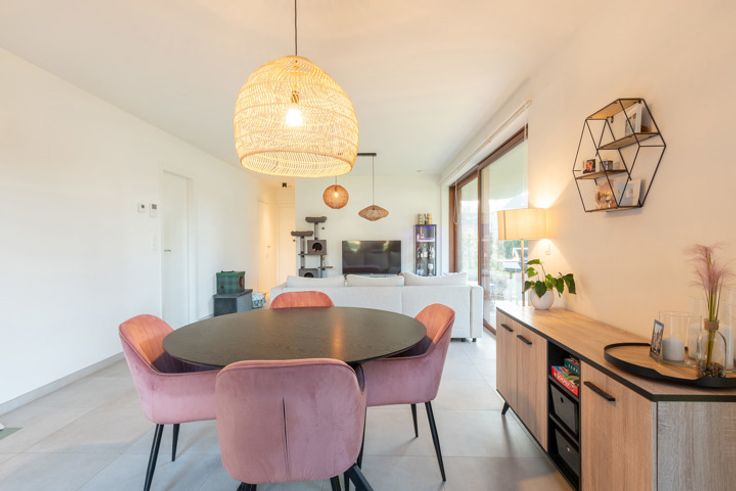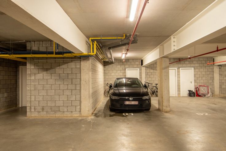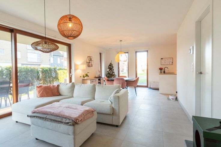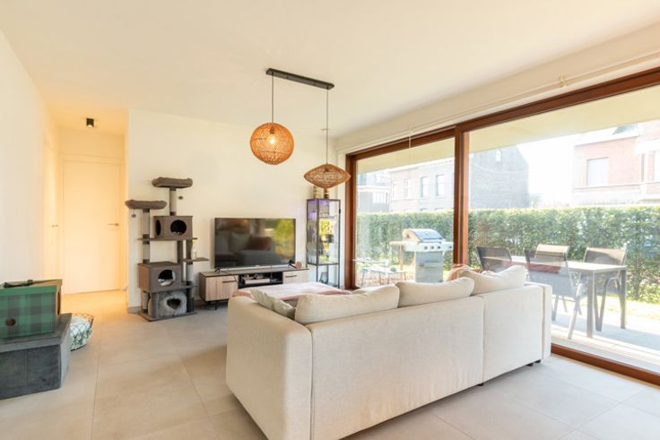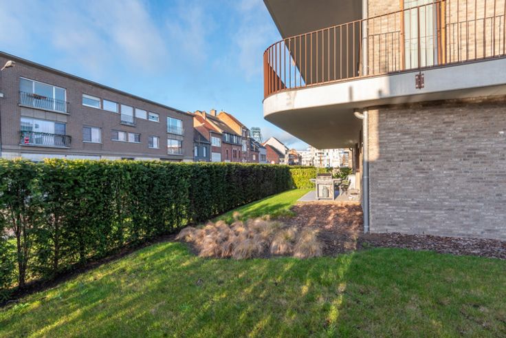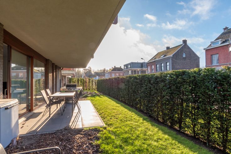 Jong gelijkvloers appartement met tuin (onderhoud incl. vaste kost) en terras. Binnen voorzien van leefruimte met veel lichtinval en open keuken, berging, apart toilet, comfortabele badkamer en 2 slaapkamers. Ondergronds is er een parking met extra bergruimte. Vaste kost 125,-euro/mnd