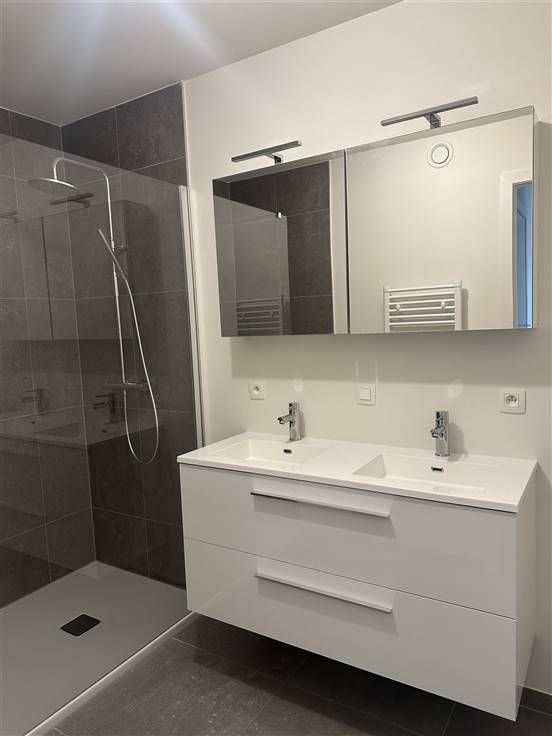 Inkomhal met apart toilet, ruime berging, ruime leefruimte met terras en volledig geïnstalleerde open keuken, badkamer met douche en dubbele lavabo, 2 slaapkamers.
