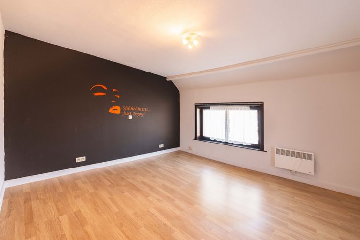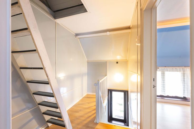 Verdieping: 1 grote slaapkamer en 1 kleine slaapkamer (laminaat, elektrische verwarming) - via schuiftrap naar zolder (mogelijkheid om derde slaapkamer bij te maken).