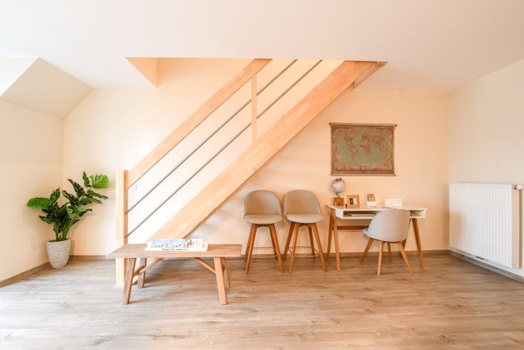Bij binnenkomst in de inkomhal vindt u handige ingebouwde kasten en een stapelbed, wat het ideaal maakt voor gasten of extra slaapgelegenheid. De ruime woonkamer is voorzien van CV-radiatoren en beschikt over aansluitingen voor internet en distributie. De houten trap leidt naar de bovenverdieping, waar de slaapkamers en badkamer zich bevinden.