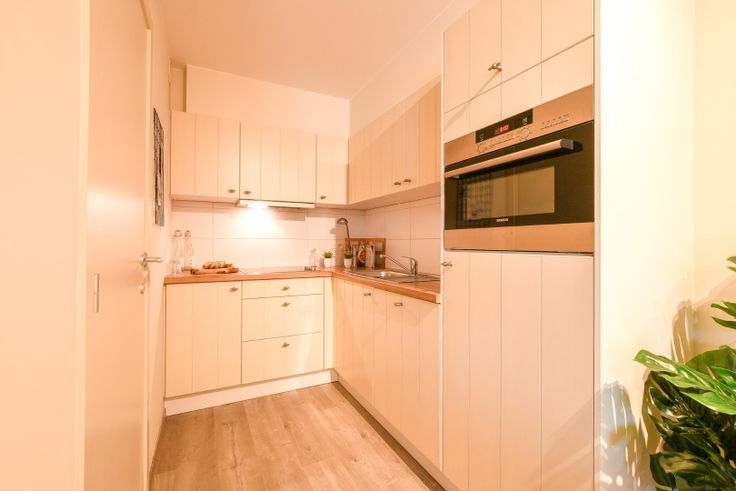 De open keuken is praktisch ingericht en uitgerust met hoogwaardige Siemens-apparatuur, waaronder een combi-oven, elektrische kookplaat, koelkast met vriesvak, en vaatwasser.