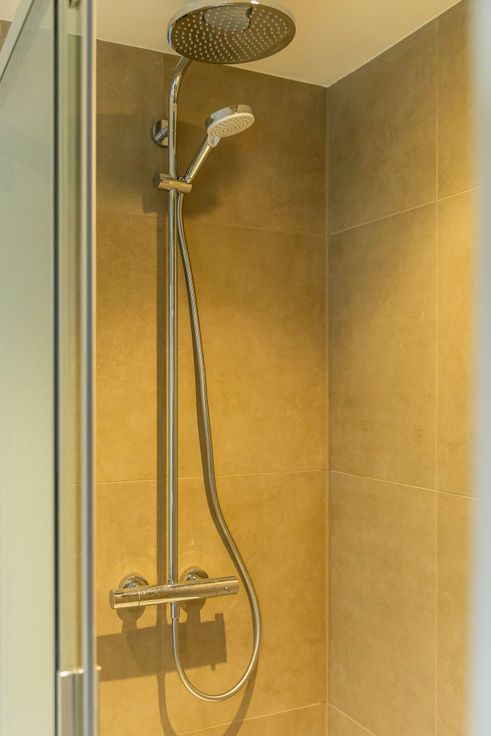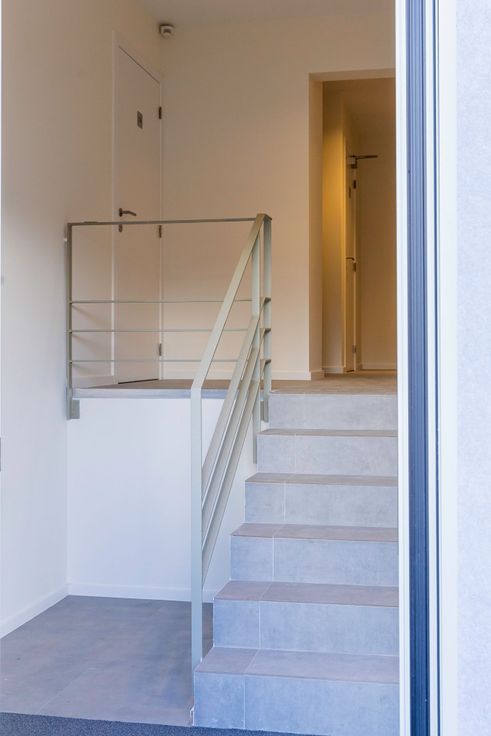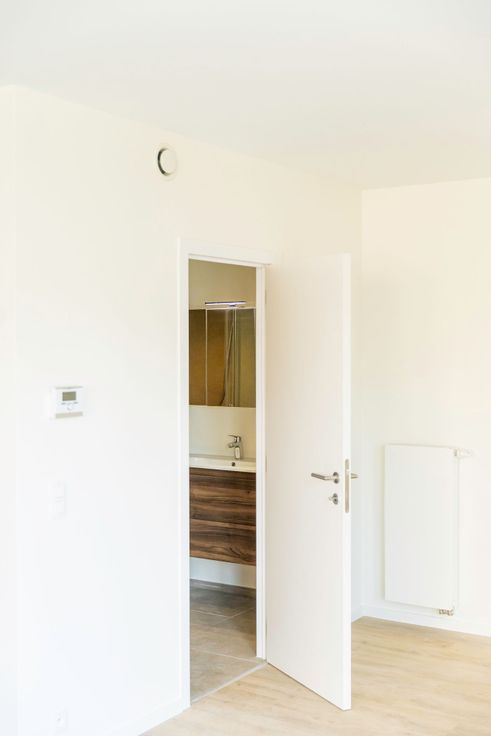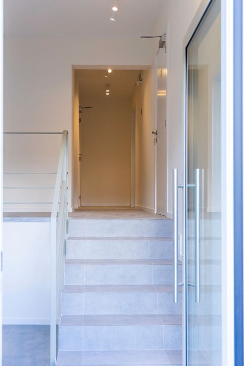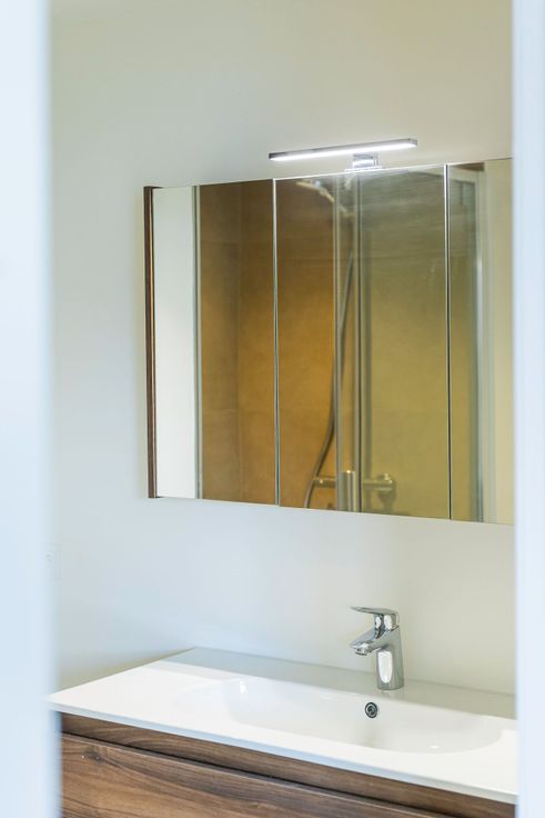 Le studio est entièrement fini (3 couches de peintures), équipé (spots placés) et prêt à être occupé. Hall d'entrée qui donne accès à un espace vestaire et d'un wc séparé. La séjour est ouvert sur une cuisine en L qui est équipée d'une taque et d'une hotte Siemens et d'un frigo + congélateur. Terrasse en façade arrière (sud) de 4m2 donnant sur le jardin commun. La salle de douche présente un large tub avec porte vitrée coulissante et d'un meuble sdb couleur noyer.