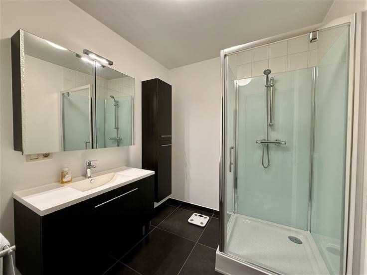 Via de trap naar de tweede verdieping bereiken we het appartement. De inkomhal leidt ons naar de gezellige en ruime leefruimte (33,6m²). Aansluitend aan de leefruimte bevindt zich de keuken. De keuken is voorzien van een kookvuur (inductie) met dampkap, een spoelbak, een combi microgolfoven, en een koelkast met diepvries.