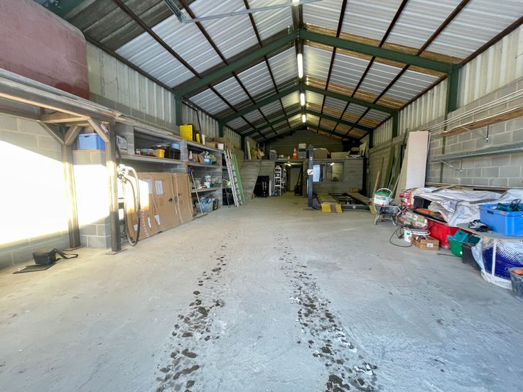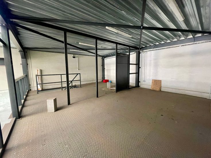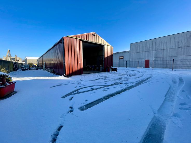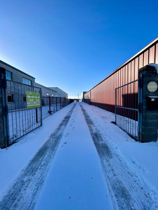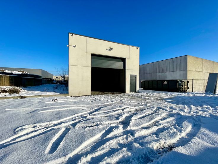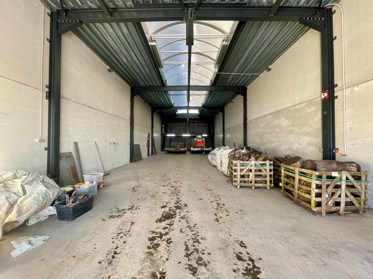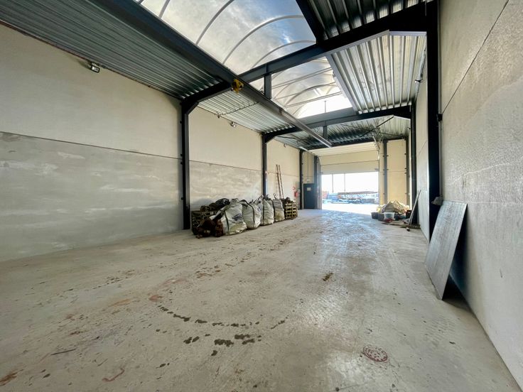 -Entrepôt 2 : construction de 2021, bâtiment de 235 m2 (+/-30x8m), murs en panneaux isolés préfabriqués en béton (ossature en acier), sol : Dale industrielle en béton poli, toiture plate + rétractable, porte sectionnelle industrielle et automatisée, mezzanine avec bureaux et wc, anciennement loué 1250€.