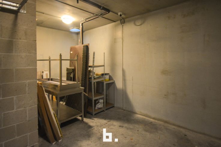 Gelijkvloers: Inkom met handelsruimte, voorzien van toonbanken - berging (tussenruimte), met achteraan een afzonderlijke ruimte voorzien van een KOELCEL en kleine werkplaats, die toegang geeft tot de garagebox - sanitaire ruimte - garagebox (30m²).