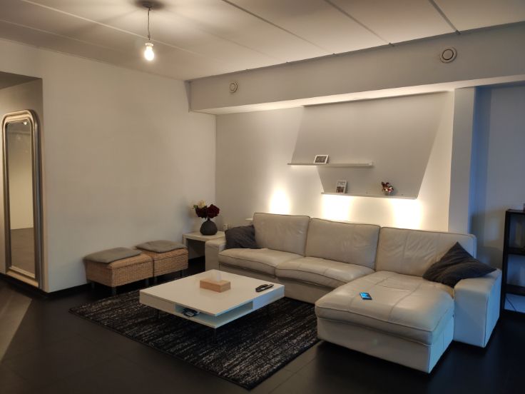 Grote living/eetkamer met volledig geinstalleerde open keuken. Volledig gevloerd.