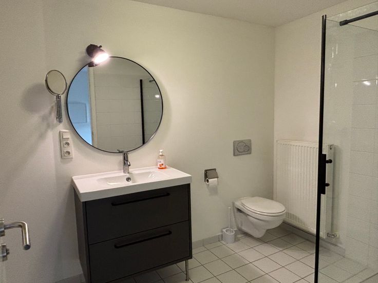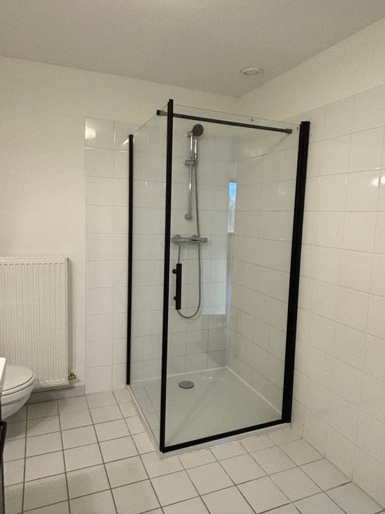 Hal, ruime badkamer met toilet, douche, lavabo en aansluiting voor wasmachine & condensatiedroogkast.