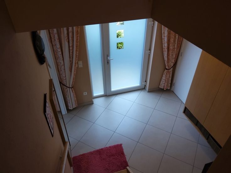 De voordeur van de moderne woning bevindt zich aan de rechterzijde. Via de hal kom je vervolgens binnen in de living met aanpalende keuken. De open keuken kijkt via een groot raam uit op de mooie en verzorgde tuin. In de hal bevindt zich de trap naar boven.