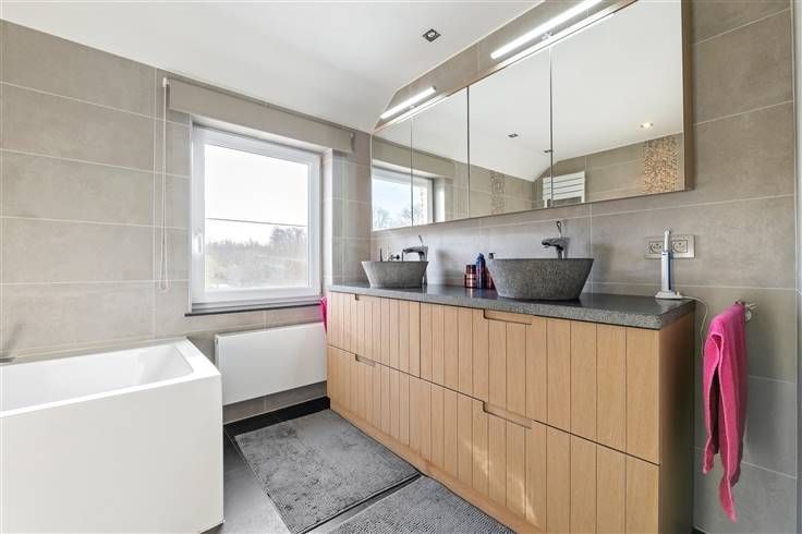 In Kerkom, een deelgemeente van Sint-Truiden, vinden we deze prachtige open bebouwing terug. Gelegen in de Hoekstraat ter hoogte van nummer 4. Het centrum van Sint-Truiden bevindt zich op slechts enkele kilometers waardoor allerlei faciliteiten, scholen en winkels vlot bereikbaar zijn. De woning vinden we terug in een residentiële buurt waar men de ideale combinatie heeft gevonden tussen een goede bereikbaarheid en de nodige rust en privacy. Deze woning is opgetrokken in 2004 en afgewerkt met hoogwaardige materialen. De ruime inkomhal geeft toegang tot de leefruimte, een apart toilet en een ruime bureau ruimte. Deze ruimte kan eveneens ingekleed worden als extra slaapkamer. De gezellige leefruimte staat in verbinding met de open keuken. Aansluitend kan men hier nog een berging terugvinden. Verder kan men op het gelijkvloers al een eerste douche kamer terugvinden. Op de eerste verdieping biedt de nachthal ons 3 slaapkamers en een badkamer. Bijkomende troef is dat de woning nog voorzien is van een volledig afgewerkte zolder! De woning is tevens voorzien van een waterput van 5.000 liter. Ook is er hier een carport voorzien voor je wagen. Als kers op de taart is deze woning voorzien van een ruime sauna en een ingebouwde jacuzzi. Maak snel een afspraak op het nummer 011/98.88.98 of via info@dewoonmakers.be De vermelde oppervlaktes zijn indicatief. De Woonmakers kan niet verantwoordelijk gesteld worden voor de juistheid van de door zijn vers