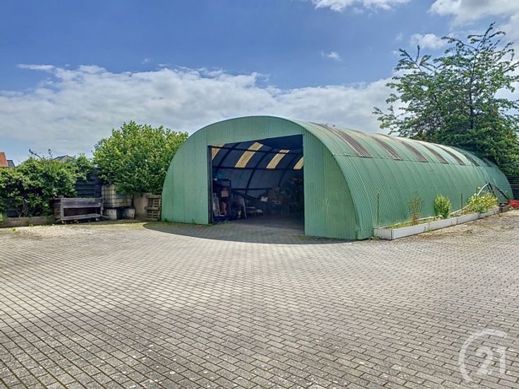 Achteraan ligt de laatste woning met een lange oprit. Deze dient volledig gerenoveerd te worden maar heeft veel potentieel en heeft een grote hangaar van 160m².