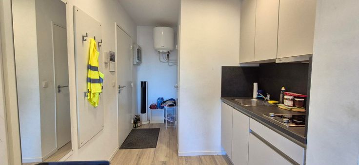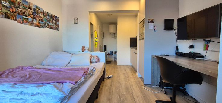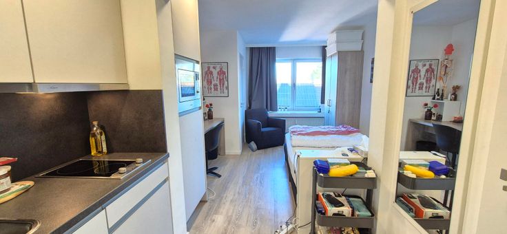 Bemeubelde studio. Omschrijving: inkomhal, badkamer (douche, lavabo en wc), keuken (koelkast, kookplaat, dampkap, oven), leef/slaapruimte en kleine berging. Gemeenschappelijke afgesloten fietsenstalling. Op korte afstand van faculteiten economie, sociale wetenschappen, theologie, psychologie, sport, wiskunde, industrieel ingenieur en het Groot-Begijnhof. Op 20 minuten wandelafstand van het Station van Leuven. Op 7 minuten fietsen van de uiterste faculteit (Industrieel Ingenieur). Voor informatie of Bezoek bel 0474/837573