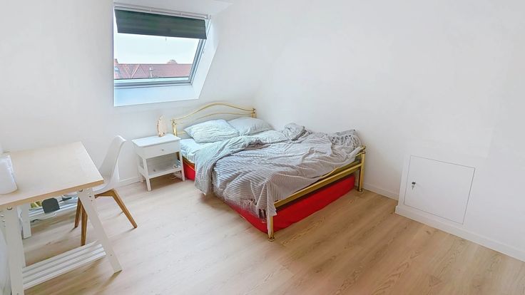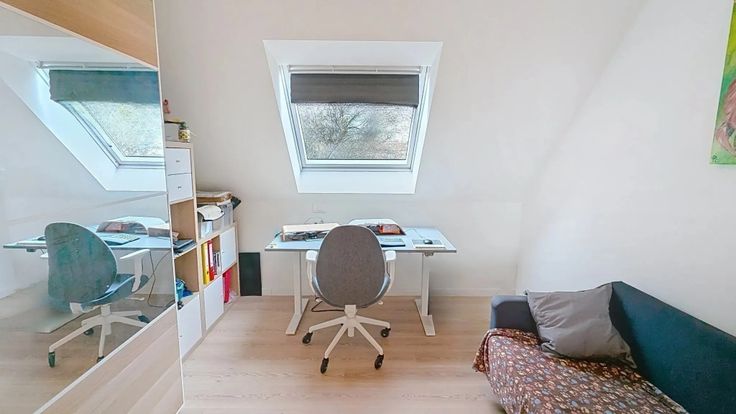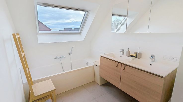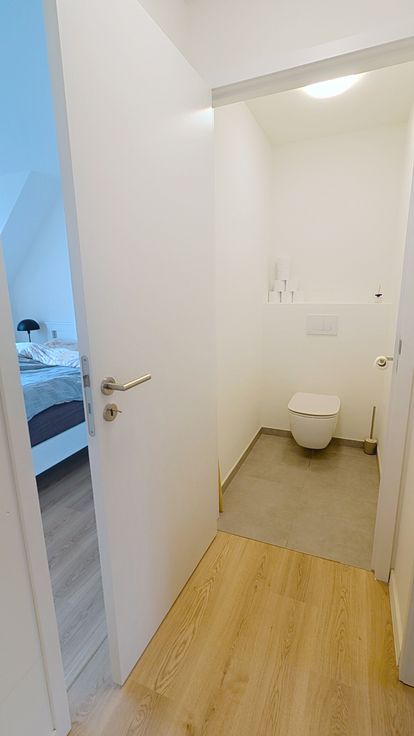 Verdieping 1: 3 slaapkamers, badkamer met douche, bad en dubbele lavabo, apart WC. Volledig voorzien van vloerverwarming. Zolderluik naar grote zolder. Alle slaapkamers voorzien van internetaansluiting.