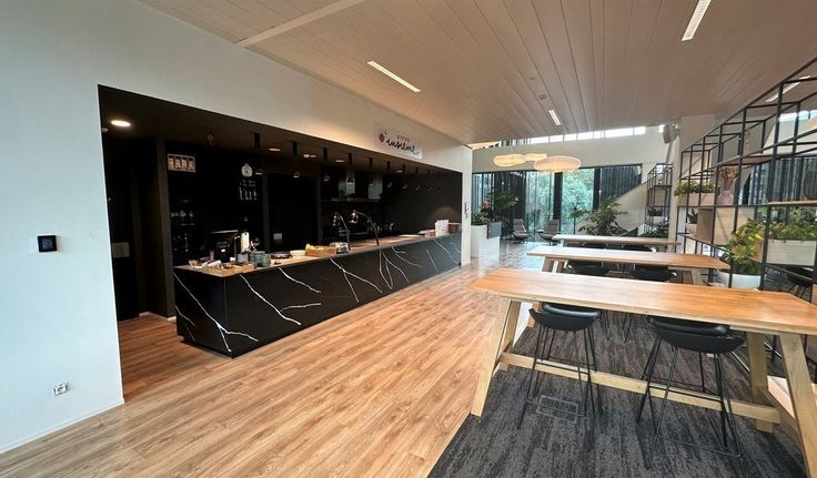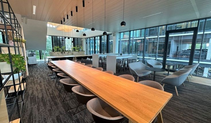 Indeling: een grote open space met 8 werkposten, twee identieke kantoorruimtes met 4 werkposten, een kleine ruimte met 4 werkposten, een kantoorruimte met 1 werkpost en extra tafel met 2 stoelen en volledig uitgeruste kitchenette met vaatwas, frigo, microgolf en spoelbak
